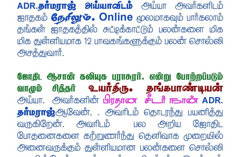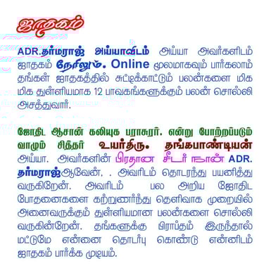 9 ஆண்டுகள் ஜொதிட அனுபவம் பெற்றவர், மிகவும் துள்ளியமாக பாரம்பரிய ஜோதிடம் பார்த்து உங்களுக்கு பலன் அளிப்பார்